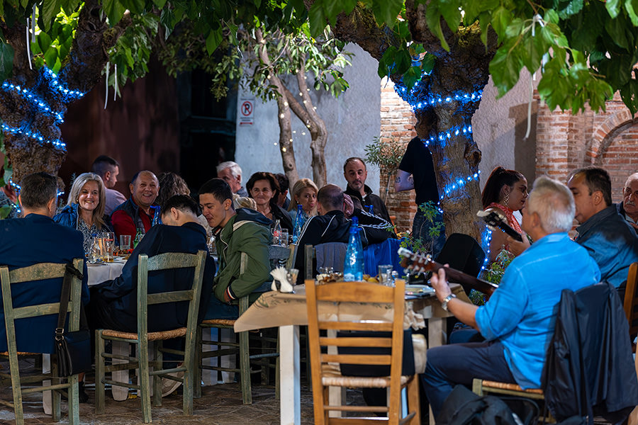 Von Dimitris erfuhren wir, dass heute Abend außer der Familie vor allem der Freundeskreis des Brautpaares eingeladen war. Entsprechend munter und turbulent ging es zu. Musiker packten ihre Instrumente aus, und an den Tischen der jungen Leute kreisten schon die ersten Wodkaflaschen. Nach den ersten Takten der Musik eröffnete das Brautpaar den Tanz, der von einem kollektiven und rhythmischen Klatschen angetrieben wurde. Der Reigen öffnete sich und nahm immer mehr Tänzerinnen und Tänzer auf. Wer gerade nicht tanzte, trank oder sang. Die Stimmung auf der Platia unter dem dichten und grünen Blattwerk der alten Maulbeerbäume schien gleichzeitig zu schweben und zu vibrieren.